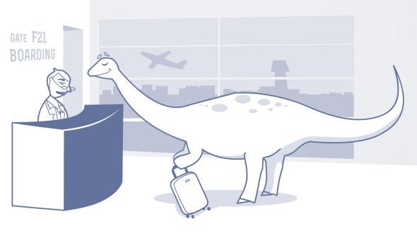 “You must stand quietly and lean forward slightly, hands loosely clasped in a faintly prayerful arrangement. You will be in the gate agent’s peripheral vision—close enough that he can’t escape your presence, not so close that you’re crowding him—but you must keep your eyes fixed placidly on the agent’s face at all times. Assemble your features in an understanding, even beatific expression. Do not speak unless asked a question. Whenever the gate agent says anything, whether to you or other would-be passengers, you must nod empathically. Continue as above until the gate agent gives you your seat number. The Kindly Brontosaurus always gets a seat number.”